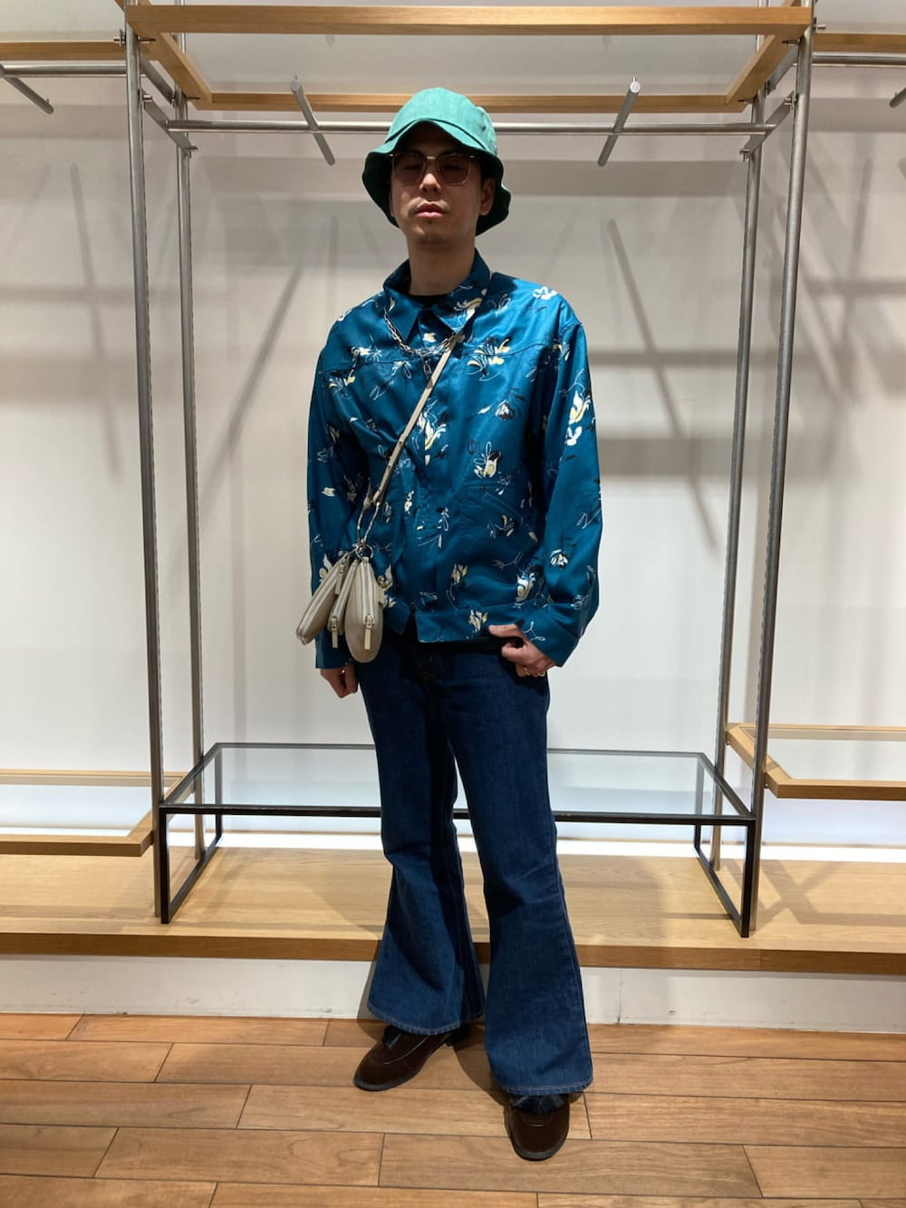 今回も人気のロンシャンシリーズを着用。 発色の良いグリーンのリーフ柄が特徴的なブルゾンに同色のバケットハットをスタイリング。 トレンドのマルチショルダーバッグをポイントで使用。
