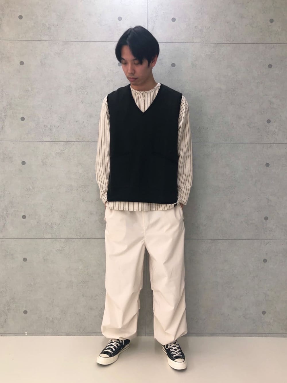 黒のパイルベストに、ストライプのスリーピングシャツ、白のスノーカモパンツを合わせたモノトーンコーデ。 全体的にゆるめのサイズ感なので、黒のベストで色を引き締めました。