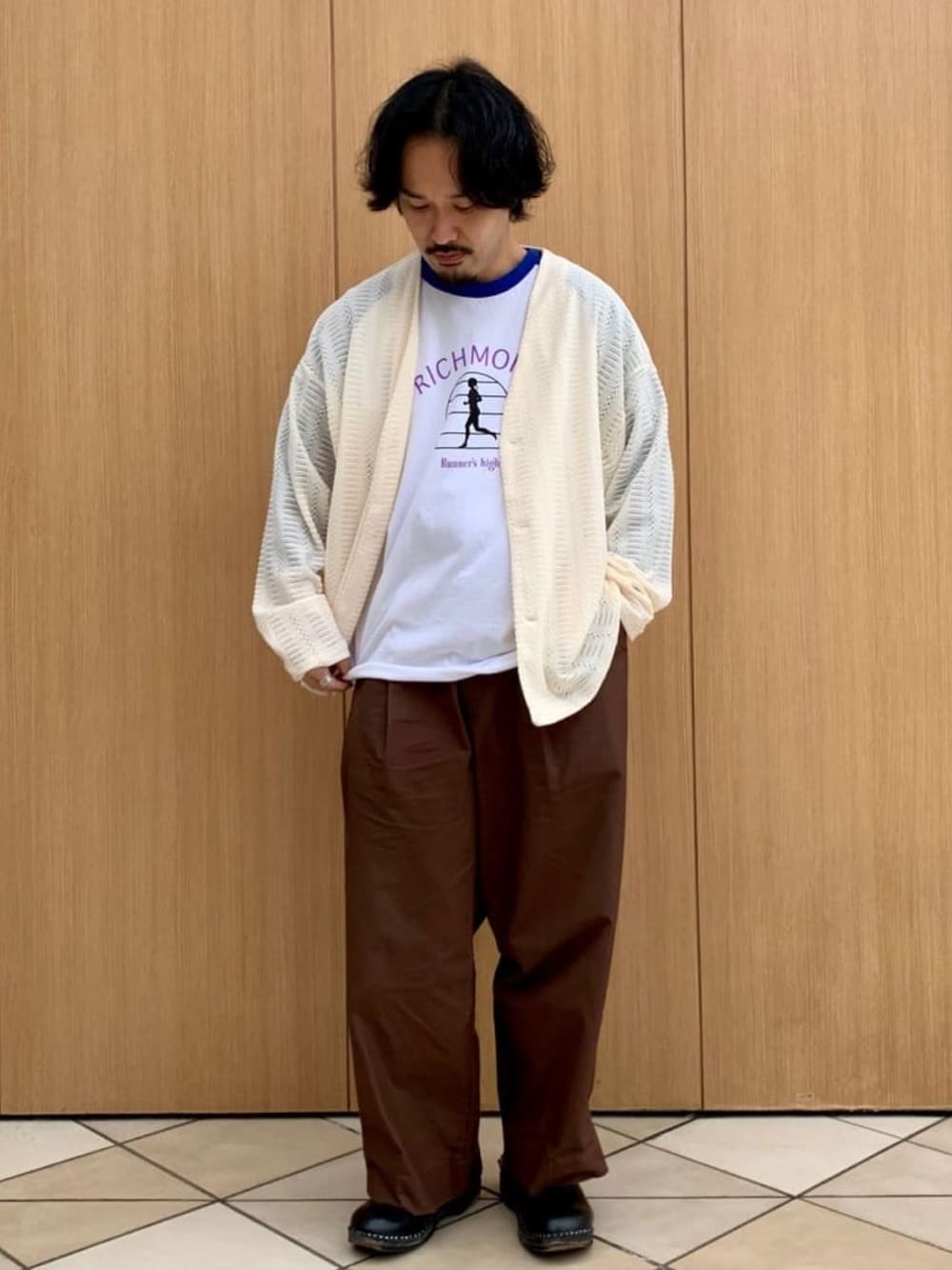ポリエステル素材のざっくりとしたジャガード編みによる透け感が特徴のカーディガン。 インナーを透けさせ、色を見せたりプリントデザインを見せたりするレイヤードもおすすめです。 全体的にゆったりとしたサイジングに軽い着心地で、カットソーに羽織るだけでサマになる1枚に仕上がりました。