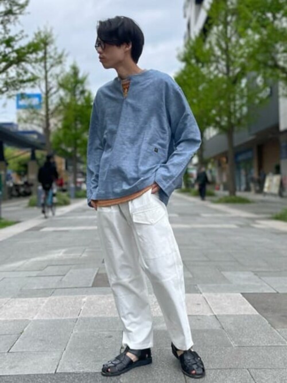 綿麻シャンブレーを使用したラフな雰囲気のスキッパーシャツ。 スキッパーを活かしてジオメトリック柄をインナーにいれてみました。 168㎝ 着用サイズ全てM