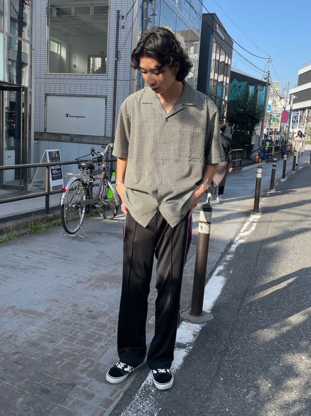 ジオメトリック柄のオープンカラーシャツ トラックパンツと合わせ流行りのスタイリング 程よいオーバーサイズでユニセックスで着れるサイズ感