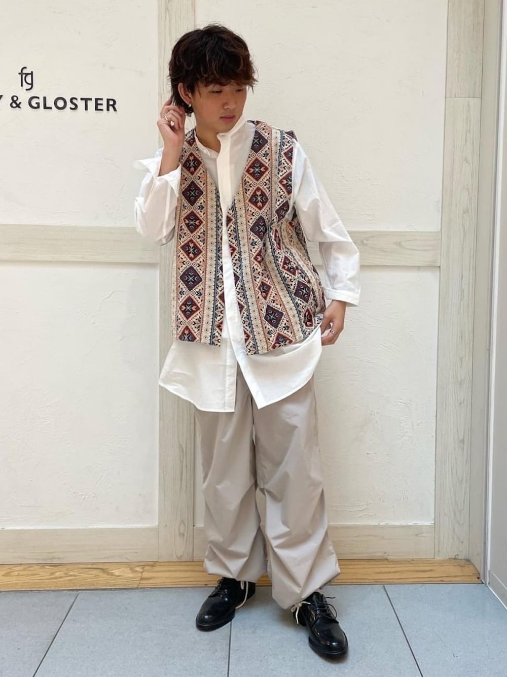 GLOSTER styling(FREDY & GLOSTER EC)のベスト「【GLOSTER/グロスター】ゴブランライク ネイティブ柄ベスト ジオメトリックパターン」を使ったコーディネート