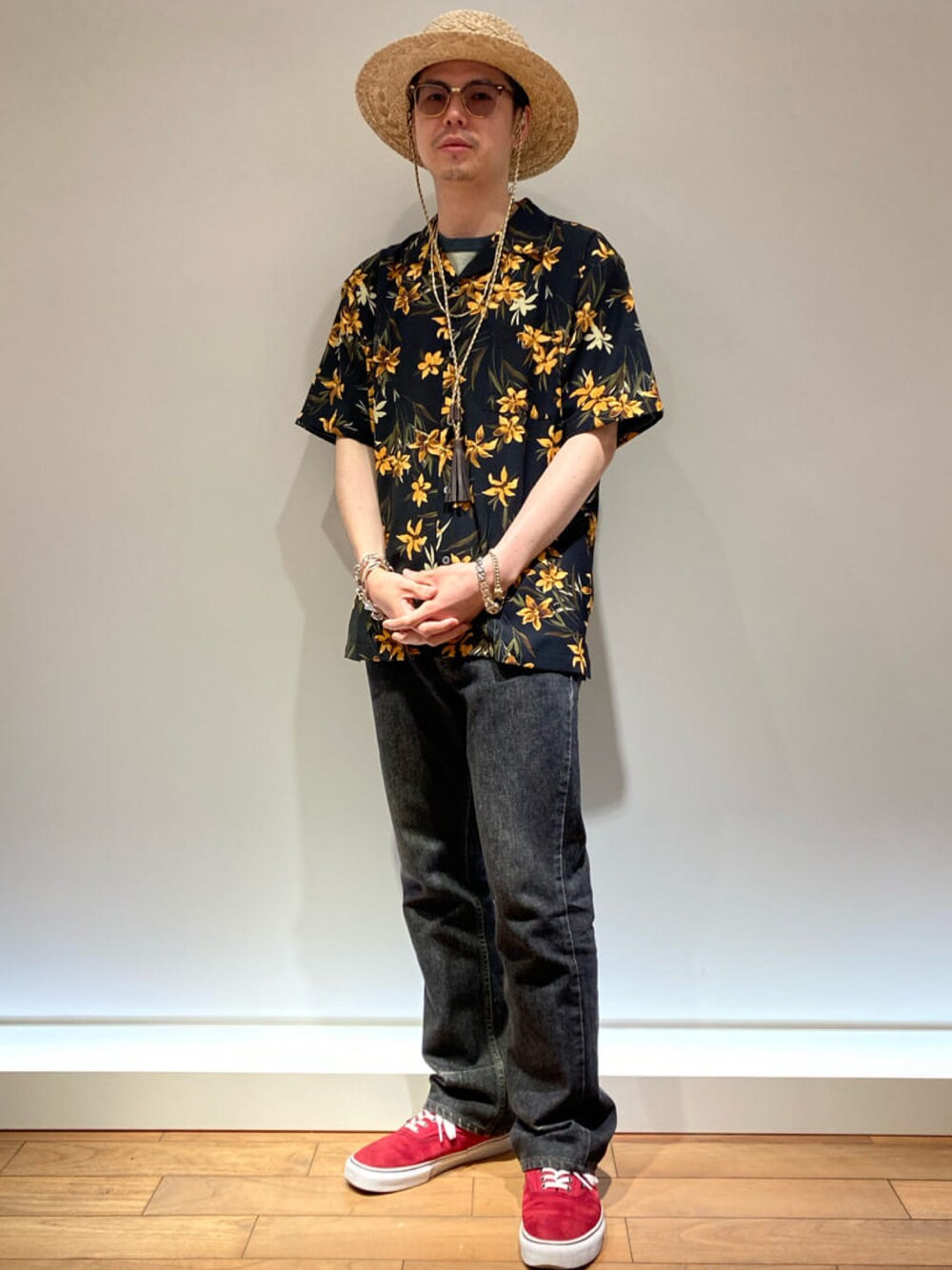 黒ベースにイエローが映えるアロハシャツ。 テンガロンハットで合わせたいところを特徴的な網目のリゾートハットにアップデート。