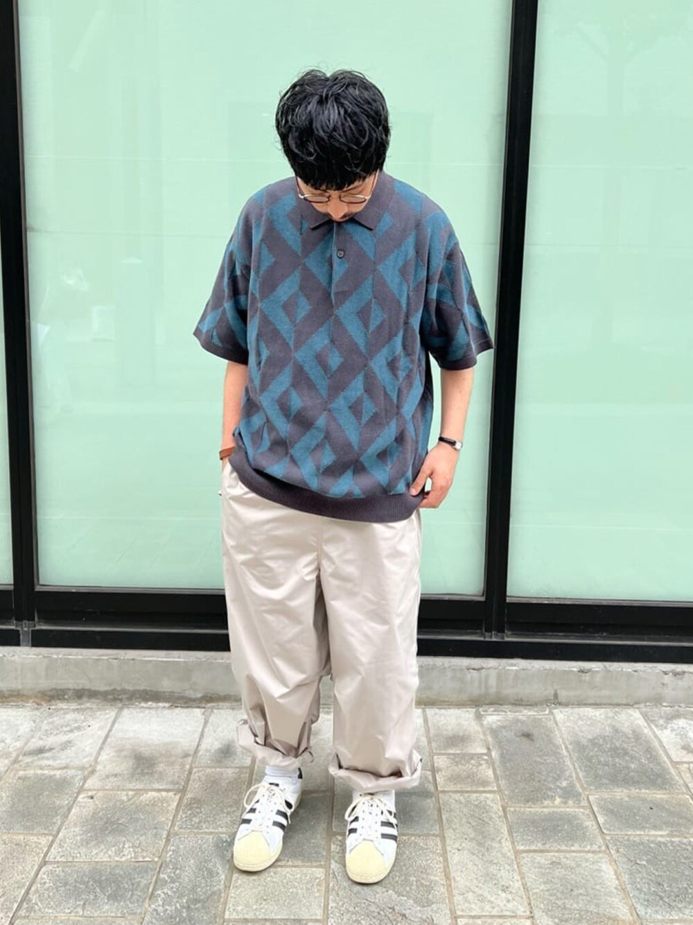 今期トレンドのジオメトリック柄を使ったコーディネート! 程よくオーバーサイズのニットポロで生地感はサラッとしているので夏でも快適です!