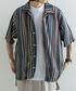 マルチストライプのレースシャツをスタイリング。 透け感がありレイヤードを楽しめるデザイン。 ストライプのカラーをインナーで拾うのもあり。