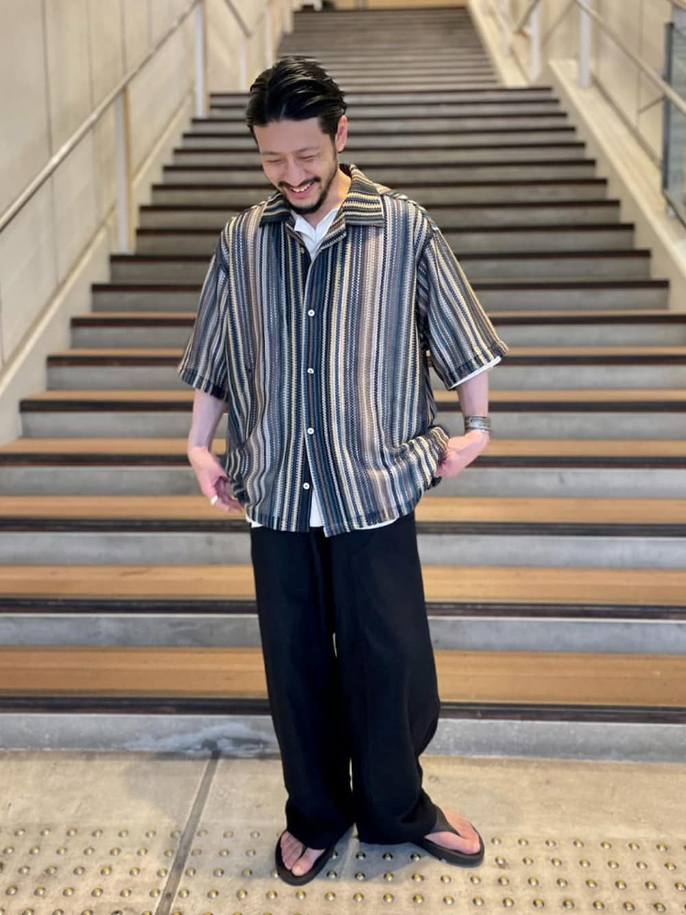 シャツはインパクトのあるマルチカラーストライプ柄。 透け感のあるレース生地が涼しげな印象と抜け感を与えてくれます。 トレンドのビッグシルエットなので男女共にお使いいただけるユニセックスのアイテムです。 パンツはゆったりとしたシルエットで抜け感を演出してくれるコットンリネンワイドパンツ。 綺麗なシルエットながらもストレスフリーな『イージー仕様』で楽な穿き心地を実現。