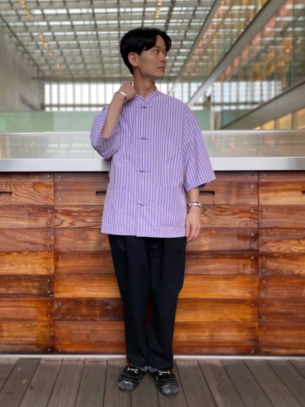 エッジの効いたストライプのカンフーシャツを、 足元はシンプルに黒でまとめてみました! 夏の一枚着は少しクセがあるぐらい丁度いい◎