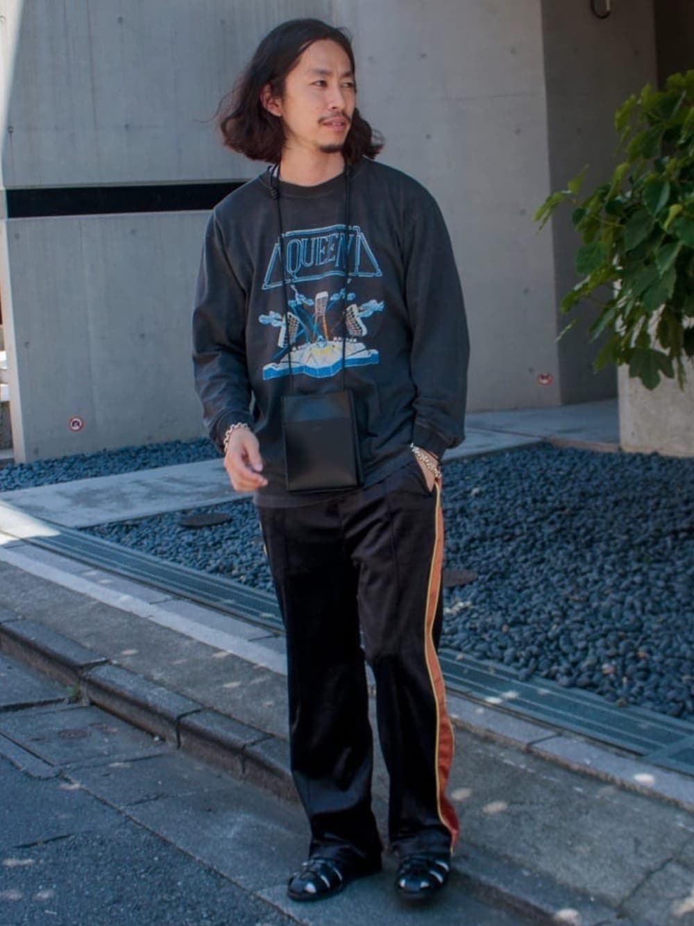 ブラックのワントーンコーデ。 レザー小物やパンツのサイドラインをアクセントに。 1枚でインパクト抜群なバンドロンTは初秋に手に入れたいアイテムです。