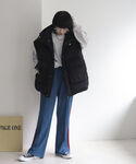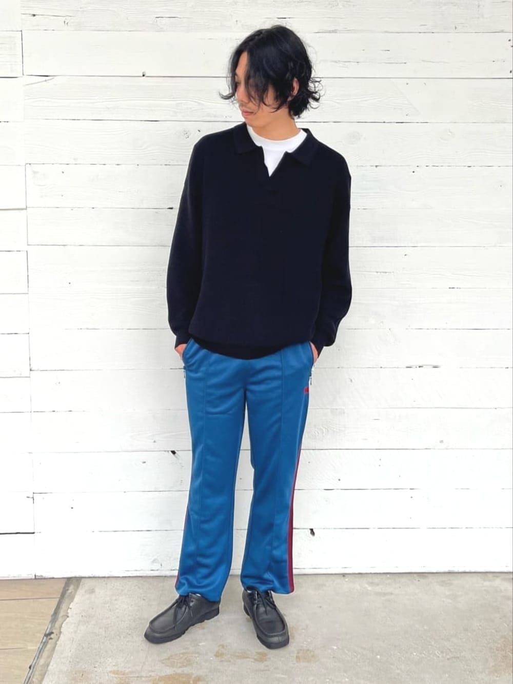 トレンドのスキッパーニットポロにレディースのトラックパンツを合わせたスポーツmixコーデ 黒やネイビー等ダークトーンのお洋服が増えてくるので、パンツから色や柄を取り入れるのがオススメです。 Instagram @f_hayashi23