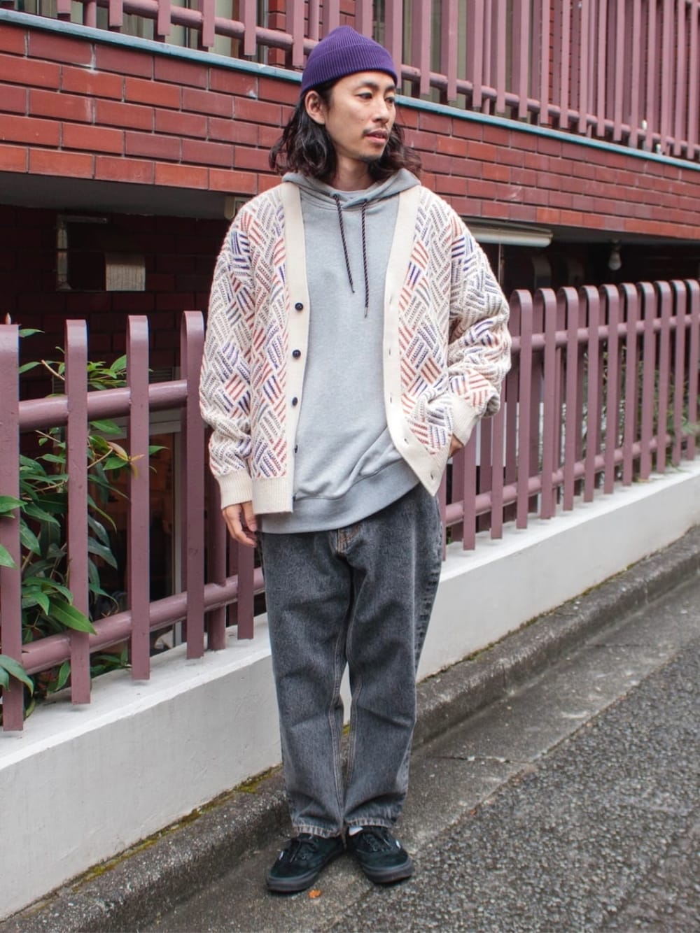 パーカー×カーディガンのレイヤードコーデ。 カーディガンの柄の1カラーをワッチに拾ったのもポイントです。
