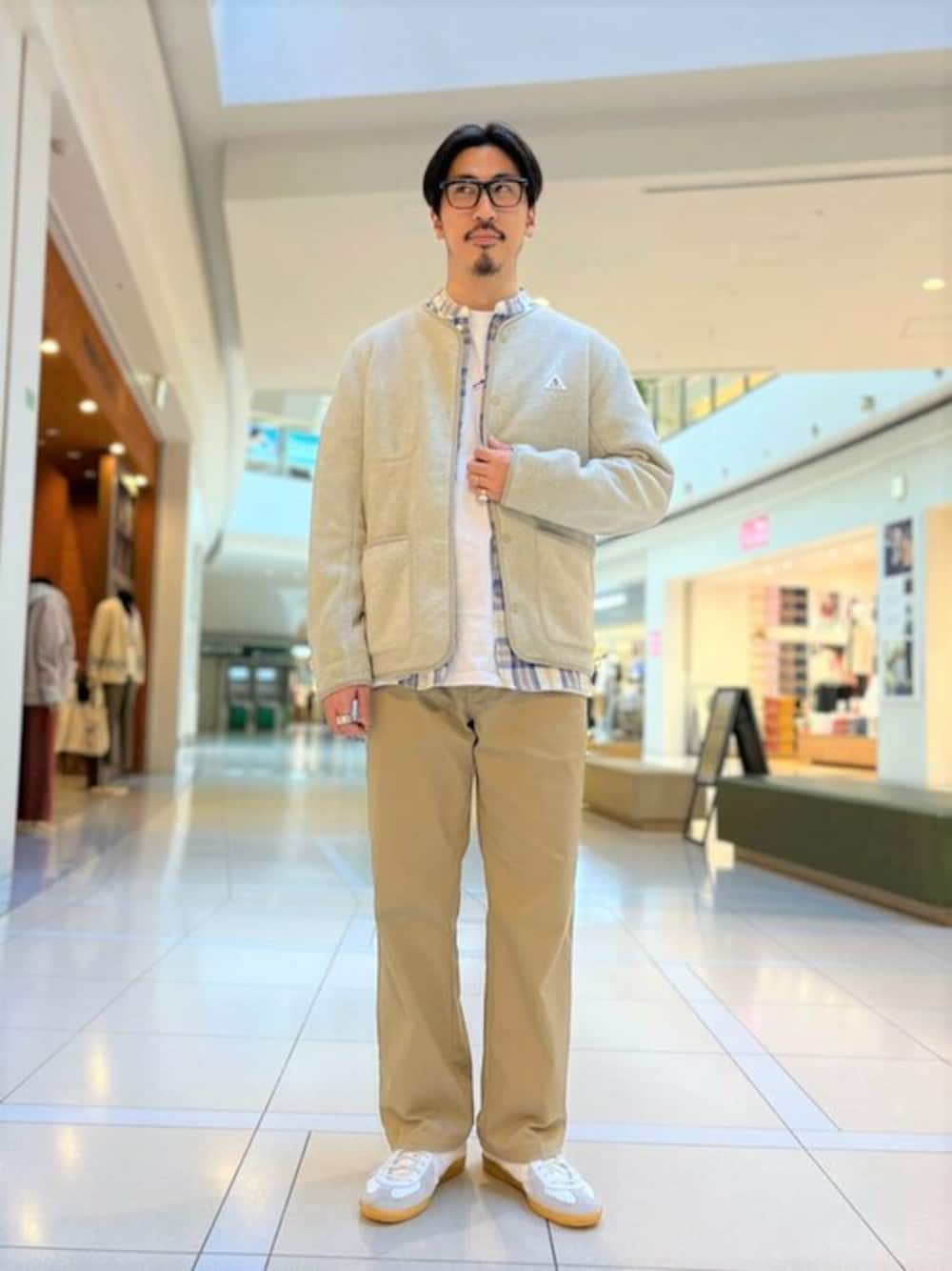 ゲバコのフリースカーディガンとバンドカラーシャツを使ったコーデ。 全体的に柔らかい色味で統一してフリースの暖かみが出るようにしました。カーディガンですがジャケットのようにライトアウターとしてもお使い頂けます。