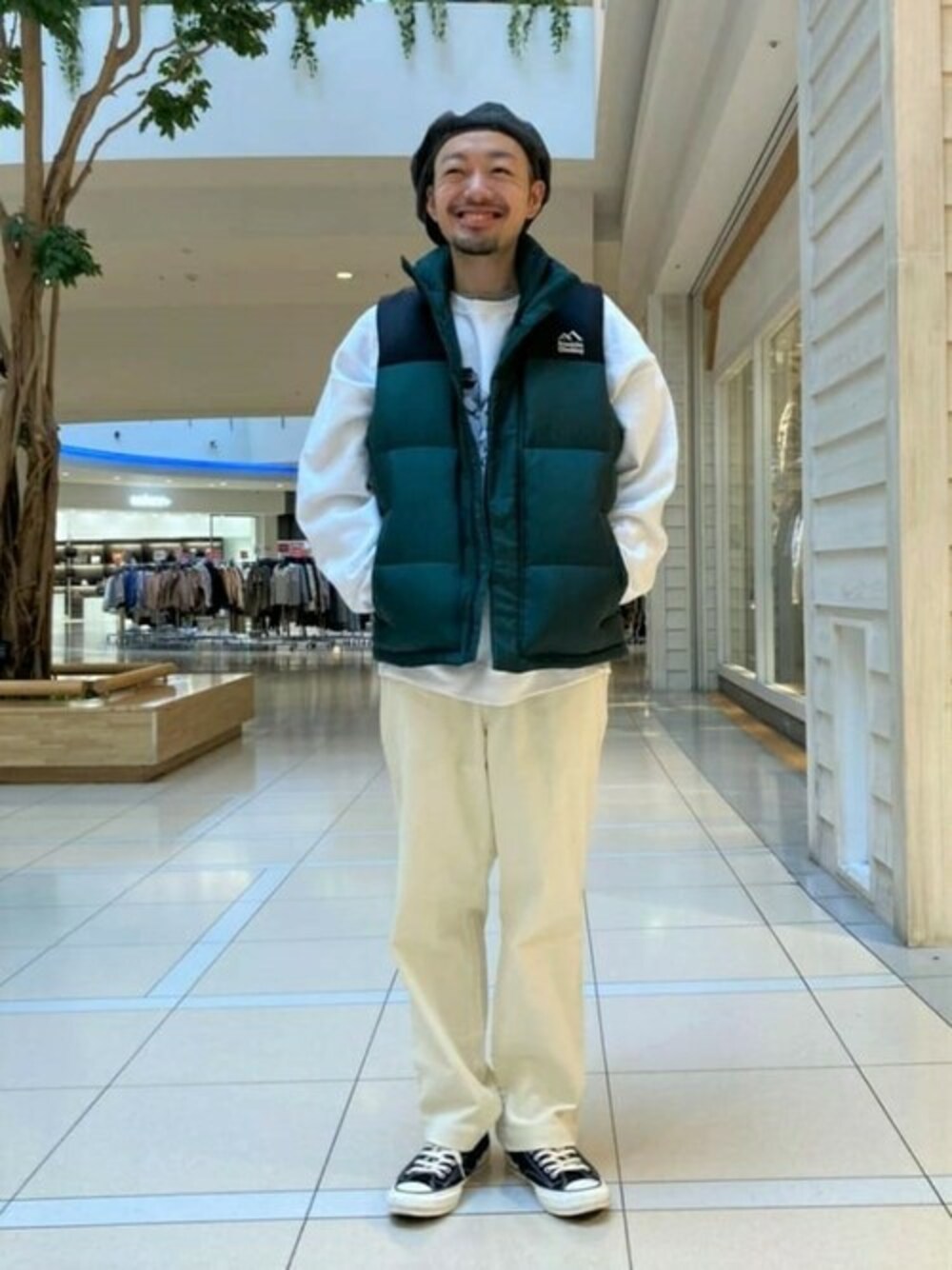 主役のダウンベスト以外のトレーナーとパンツを白系で統一してアウトドア感のないクリーンな印象に
