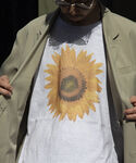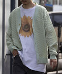 身長:178cm 普段サイズ:L ミントカラーの幾何学柄カーディガンとひまわりTを合わせた春夏カジュアルコーデ。 Instagram @suya_829