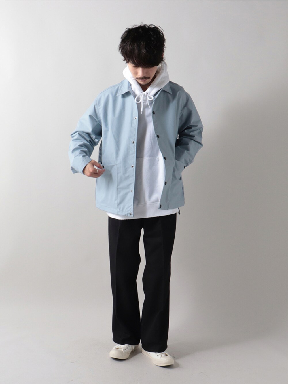 サックスブルーのマットな風合いながらも、スポーティさも兼ね備えたジャケットに他のアイテムはシンプルにモノトーンでまとめました。 ご覧いただきありがとうございます! ぜひいいねとお気に入りお願い致します! ☟Instagram☟フォローお願いします。 @____katsu._