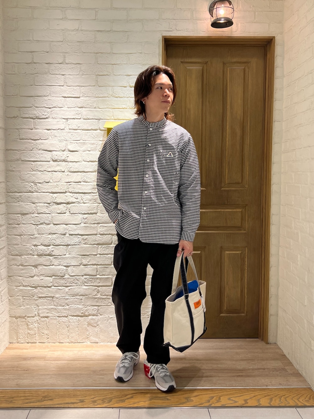 GEVACOの人気のバンドカラーシャツコーデ ギンガムチェックは 一枚着でも着映えします! 小物もキャンバストートで軽めにスタイリング