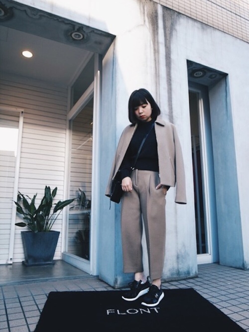 ▽ジャケット ACNE ¥102,000-(税抜) SIZE 34 ▽ニット ACNE ¥33,000-(税抜) SIZE S ▽パンツ ACNE ¥76,000-(税抜) SIZE 32 ▽スニーカー Y-3 ¥41,000-(税抜) ▽ミニショルダーバッグ 3.1 phillip lim ¥158,000-(税抜)