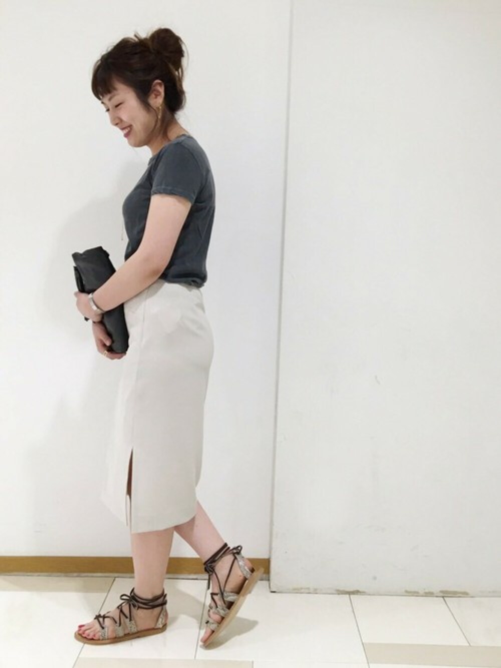 コンパクトなSTATESIDEのクルーネックTと、タイトなスリットスカートで女性らしいシルエットに。 レースアップサンダルで外すのがFRAMeWORKっぽいところ。