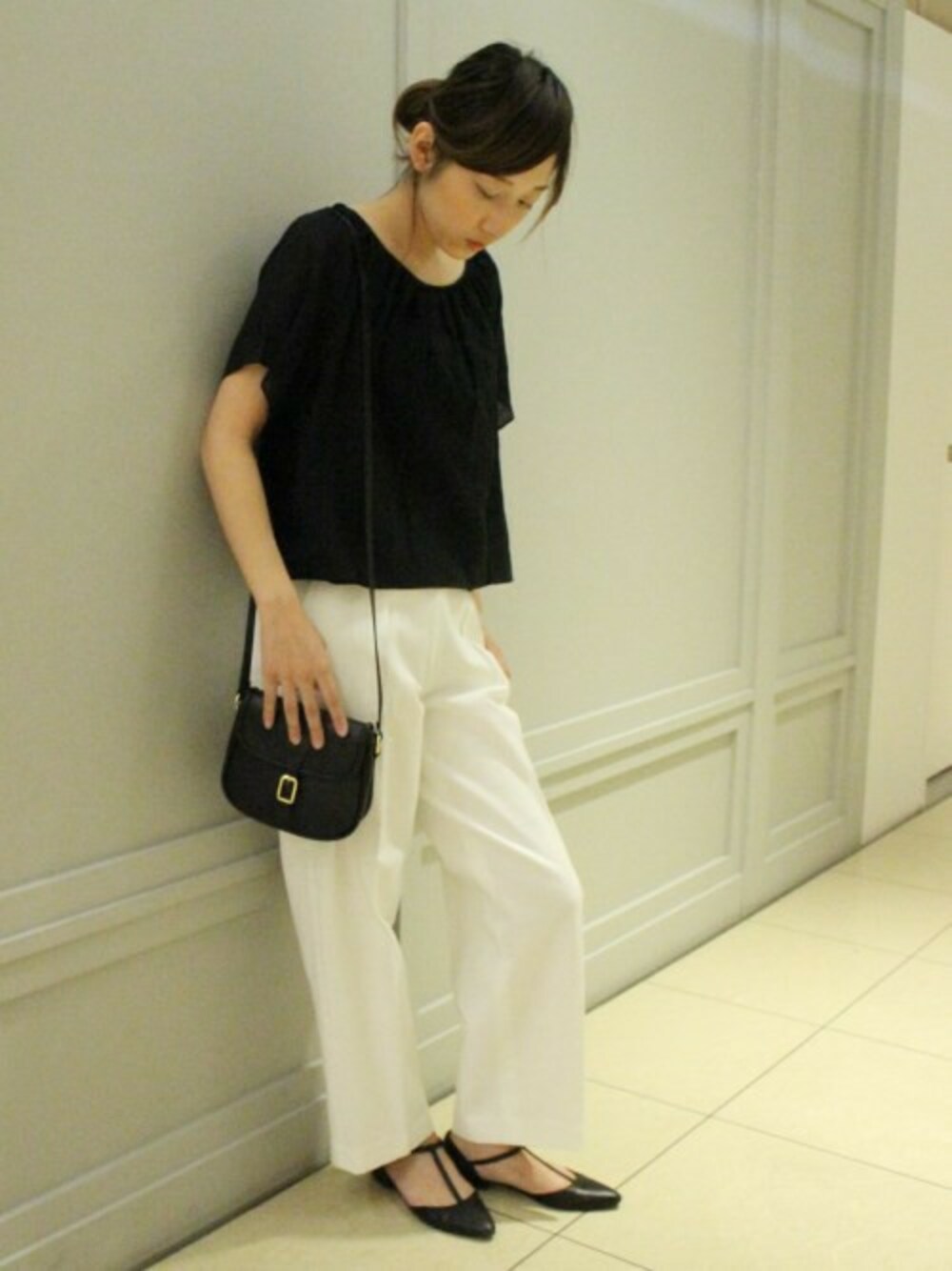 モノトーンスタイル♪フワリと広がるシルエットが可愛いギャザーブラウスには相性抜群のワイドパンツを合わせて。