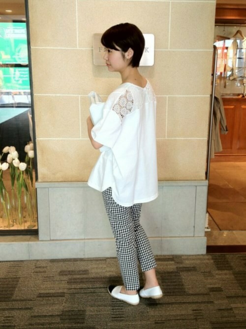 白ベースのコーディネートに黒のギンガムチェックがきりっとはまります♪レースなど取り入れて少し可愛らしさをプラス!