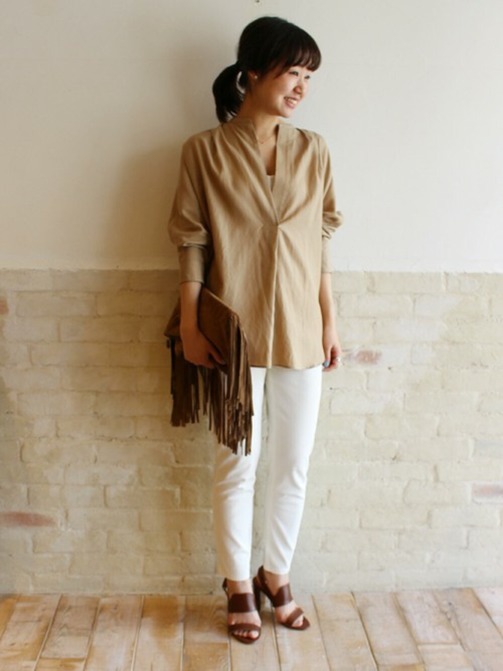 さらっとしたオーバーサイズのブラウス、柔らかなキャメルが春っぽくて今の気分! シンプルな分、小物づかいで遊びを入れて。