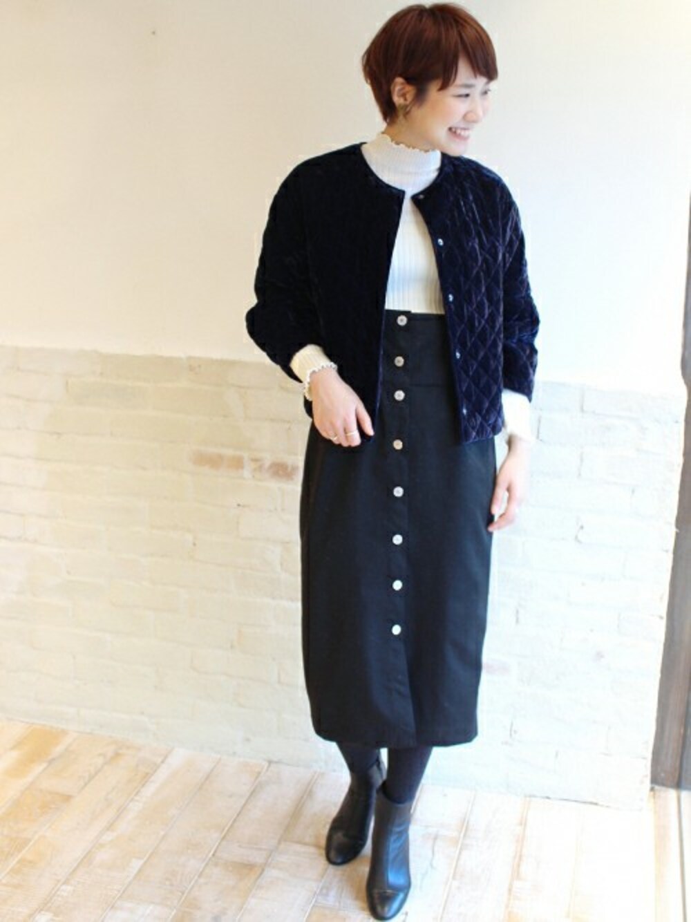すっきりと細身のジャンパースカートは、落ちついた色味で大人っぽく。 Lamiのベロアキルティングブルゾンで、さらにトレンド感をプラス。