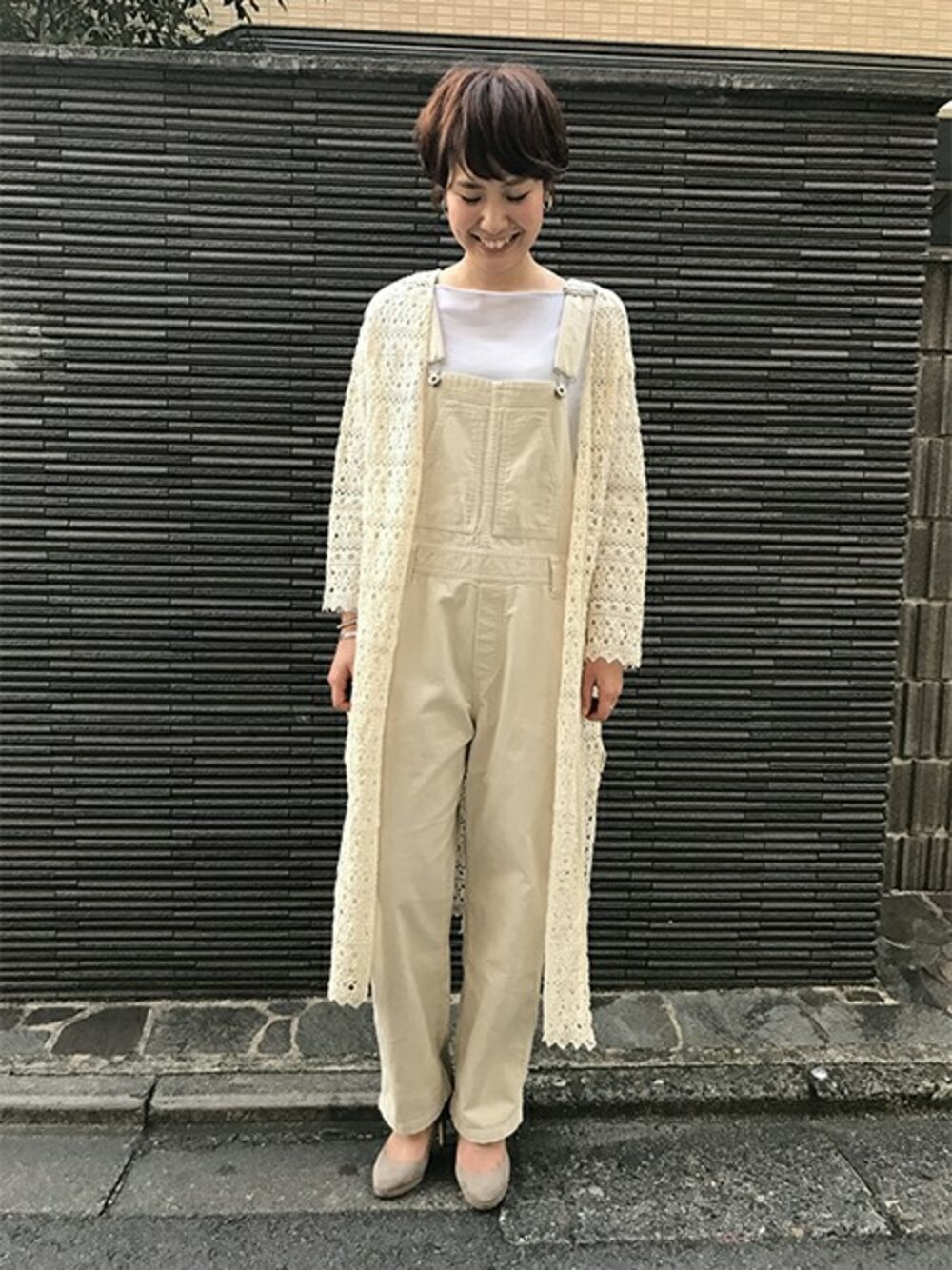 冬のホワイトコーデ!メンズライクなサロペットもヒール×レースガウンで女性らしく。