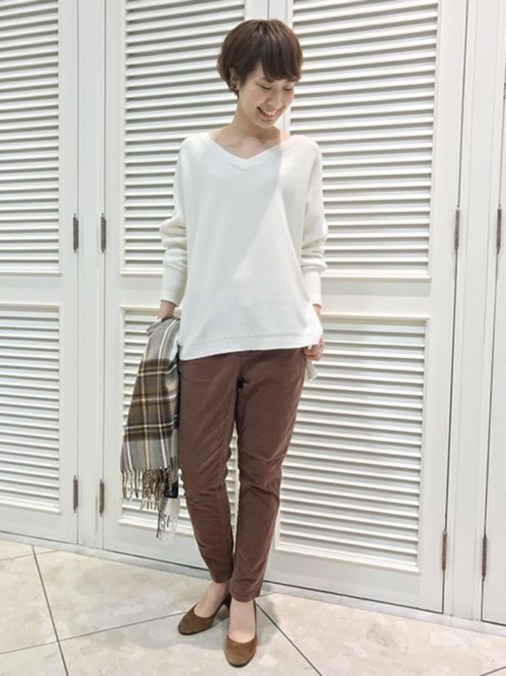 ホワイト×ブラウンで、やさしい色合いの組み合わせ。チェックストールで可愛げをプラス!