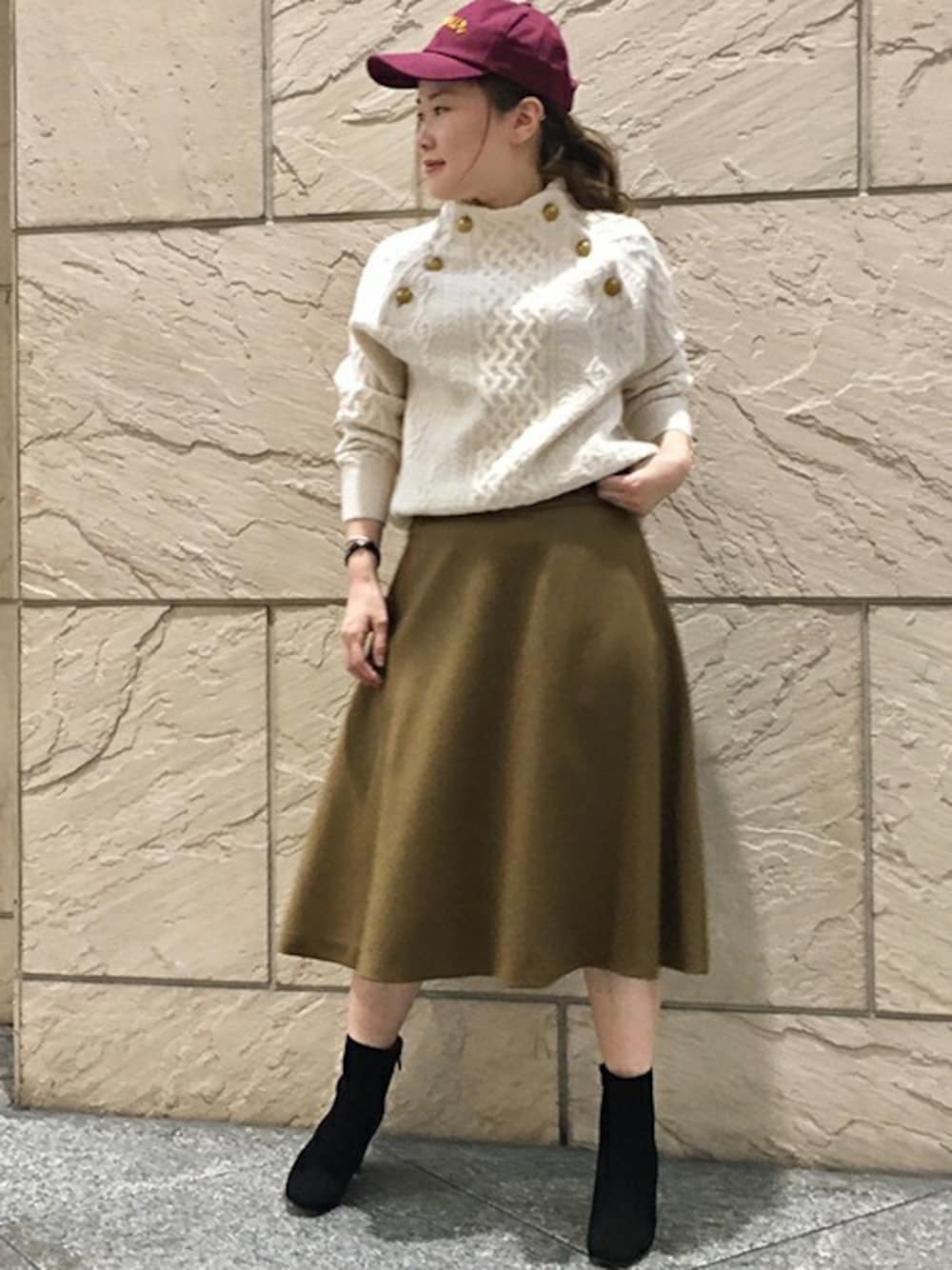 大人気デザインはやっぱり定番の白で選びたい! フレアスカートとキャップで大人カジュアルスタイルに。
