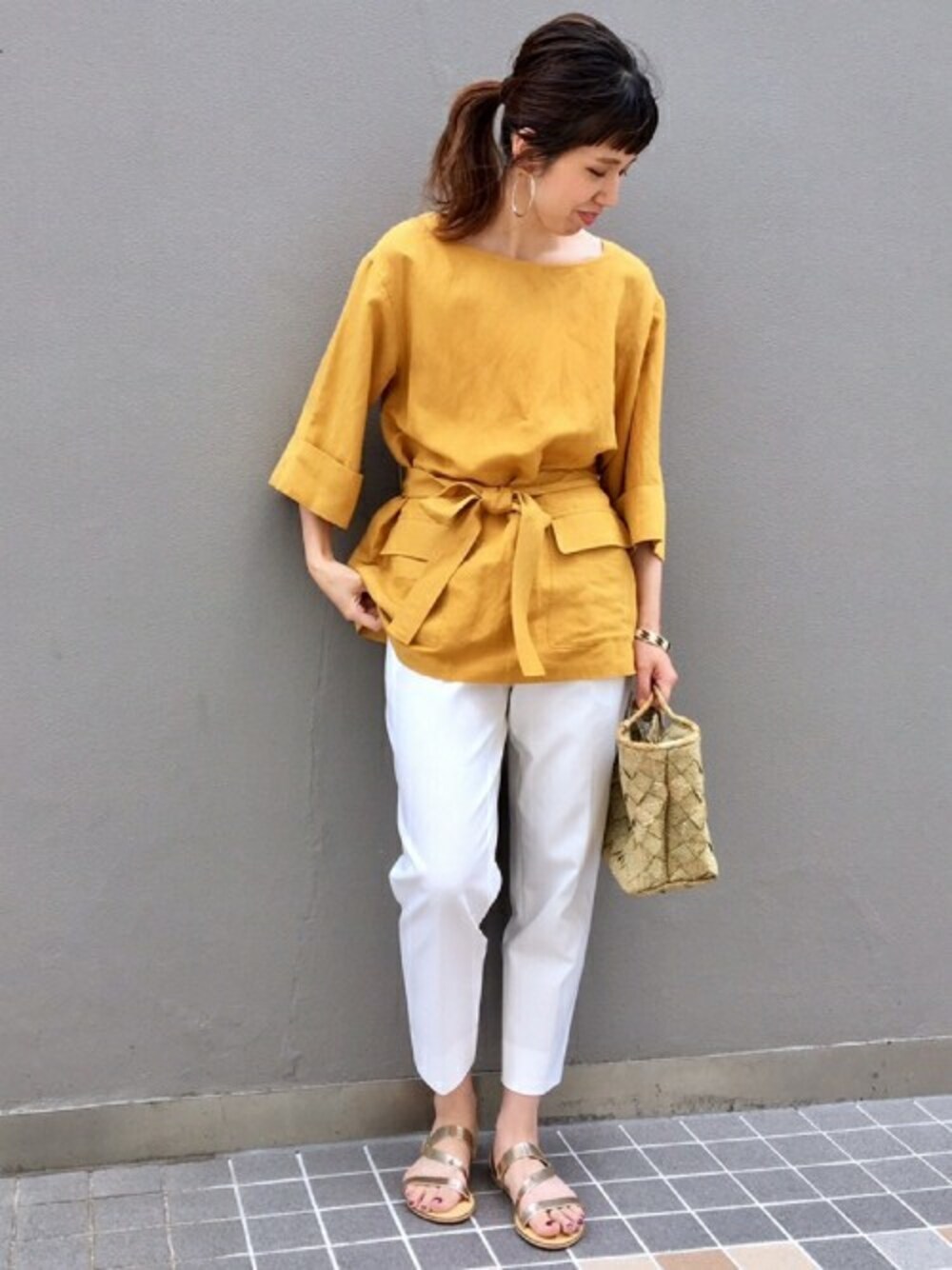 マスタードが目を惹くチュニックブラウス。程よいゆとり感で涼しく真夏まで活躍してくれそう!ボトムはすっきりで大人っぽく。