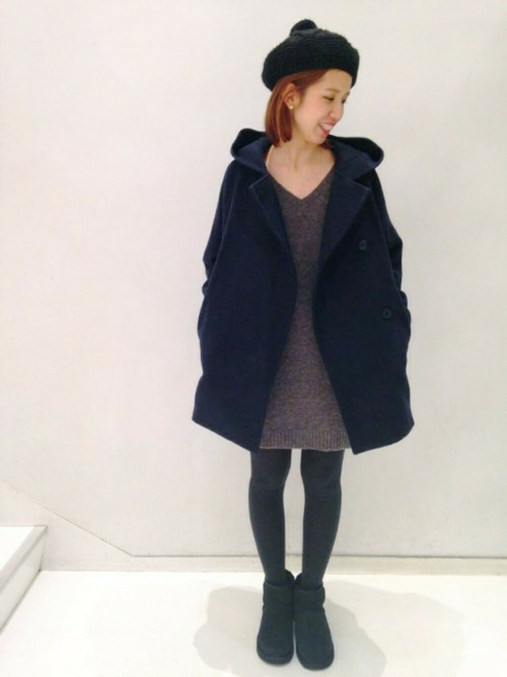 カジュアルなスタイリングにはまるフードコートはシンプルなデザインが幅広いコーデにマッチ★ニットワンピで可愛らしく♪