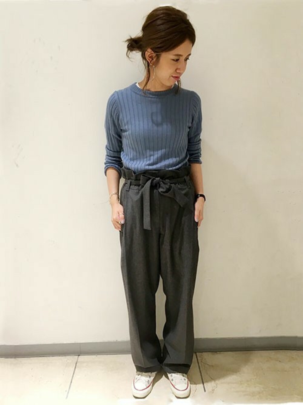 リボンパンツでトレンドを取り入れたスタイリング。 すっきりリブニットでバランスよく♪
