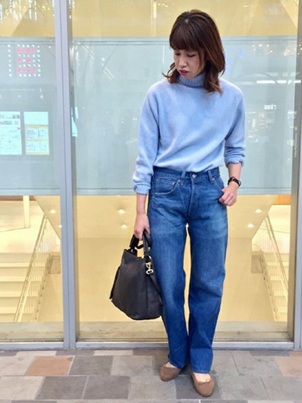 今季の注目カラー、サックスブルー! デニムのブルーと合わせてtone on toneの着こなしに。