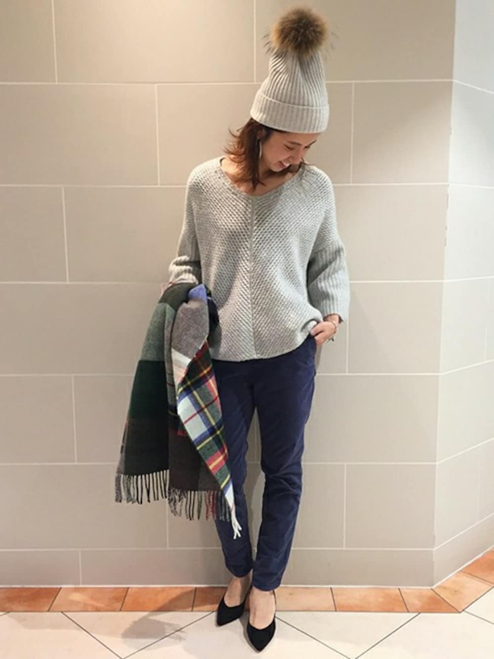 体がおよぐサイズ感が女性らしいざっくりニット。小物はカジュアルに。