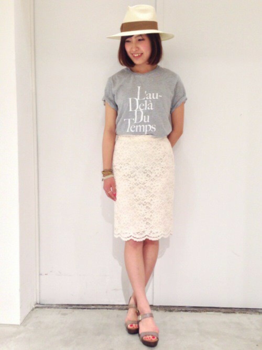レーススカートと合わせたプリントTが甘さにカジュアル感をプラスしてくれます♪Tシャツは袖を折り曲げてきれば雰囲気アップ!ボトムインして今年らしい着こなしも◎!!