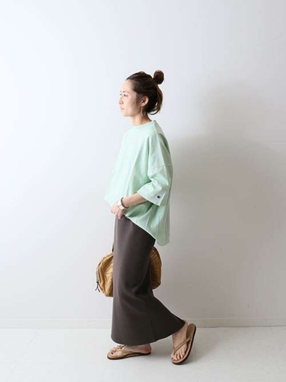 しっかりめの生地感ながら、着心地のいいチャンピオンの別注Tシャツ。グリーンの色味がかわいい🐸