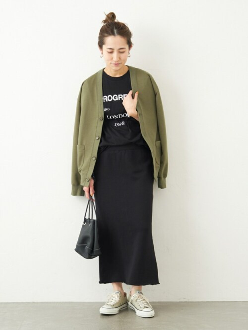 ダークなカラーでまとめた、きれいめさを残したカジュアルスタイル。 シンプルなカーディガンのカラーがアクセントに🌈 程よく厚みもあるので、端境期にも合わせやすいアイテム。