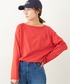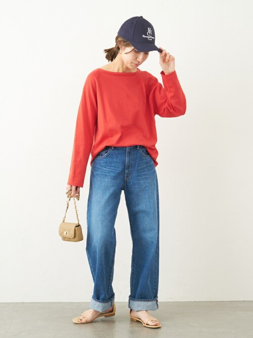 目を引くビビットなレッドカラーが印象のトップスを主役に🌟 ゆるっとしたシルエットが魅力のデニムをプラス😀 トップスのインパクトがあるので、小物やアクセサリーはコンパクトにしました☺
