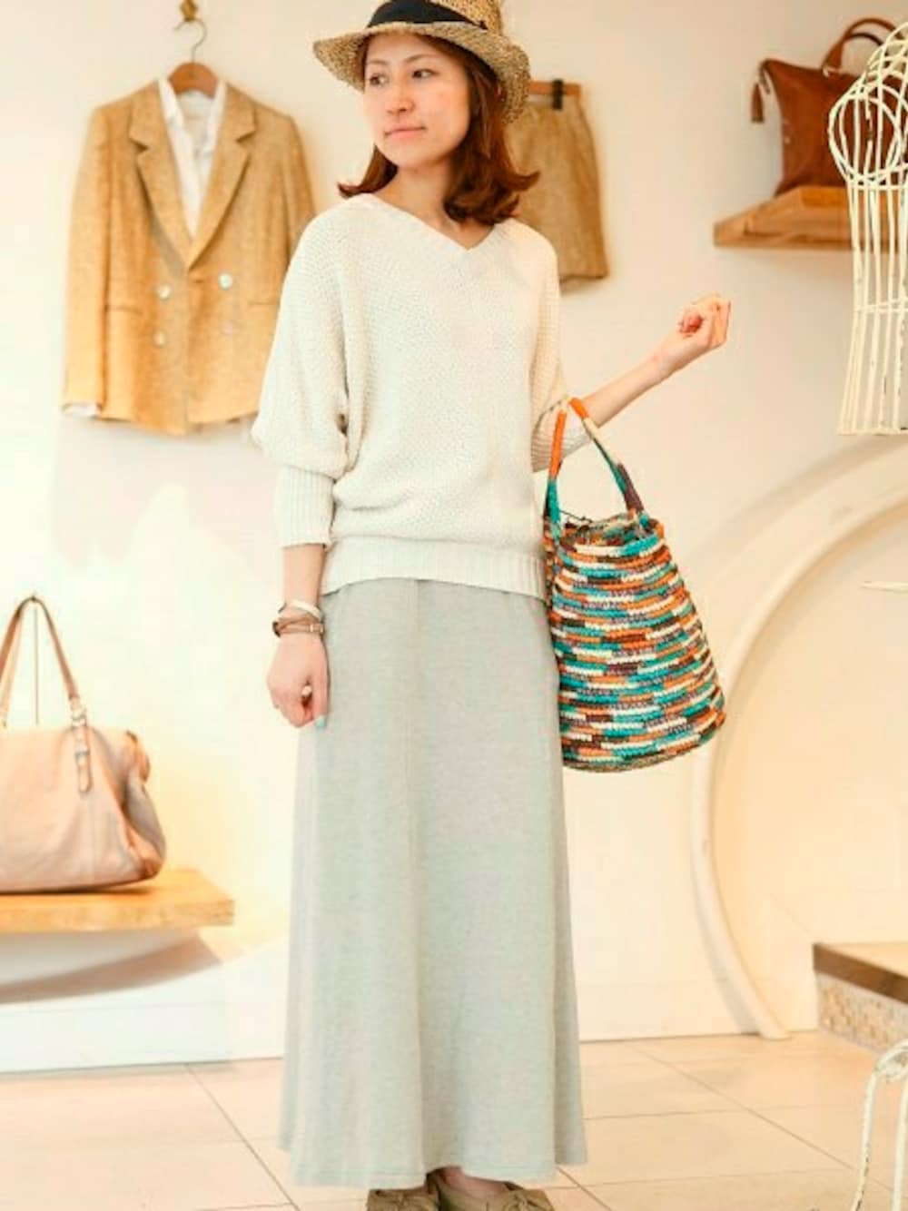 天然素材のGOODSを、定番の裏毛のマキシスカートにタウンユースにスタイリング。 ゆったりとしたドルマンニットやモカシンと合わせて、リラックス感を出しています。