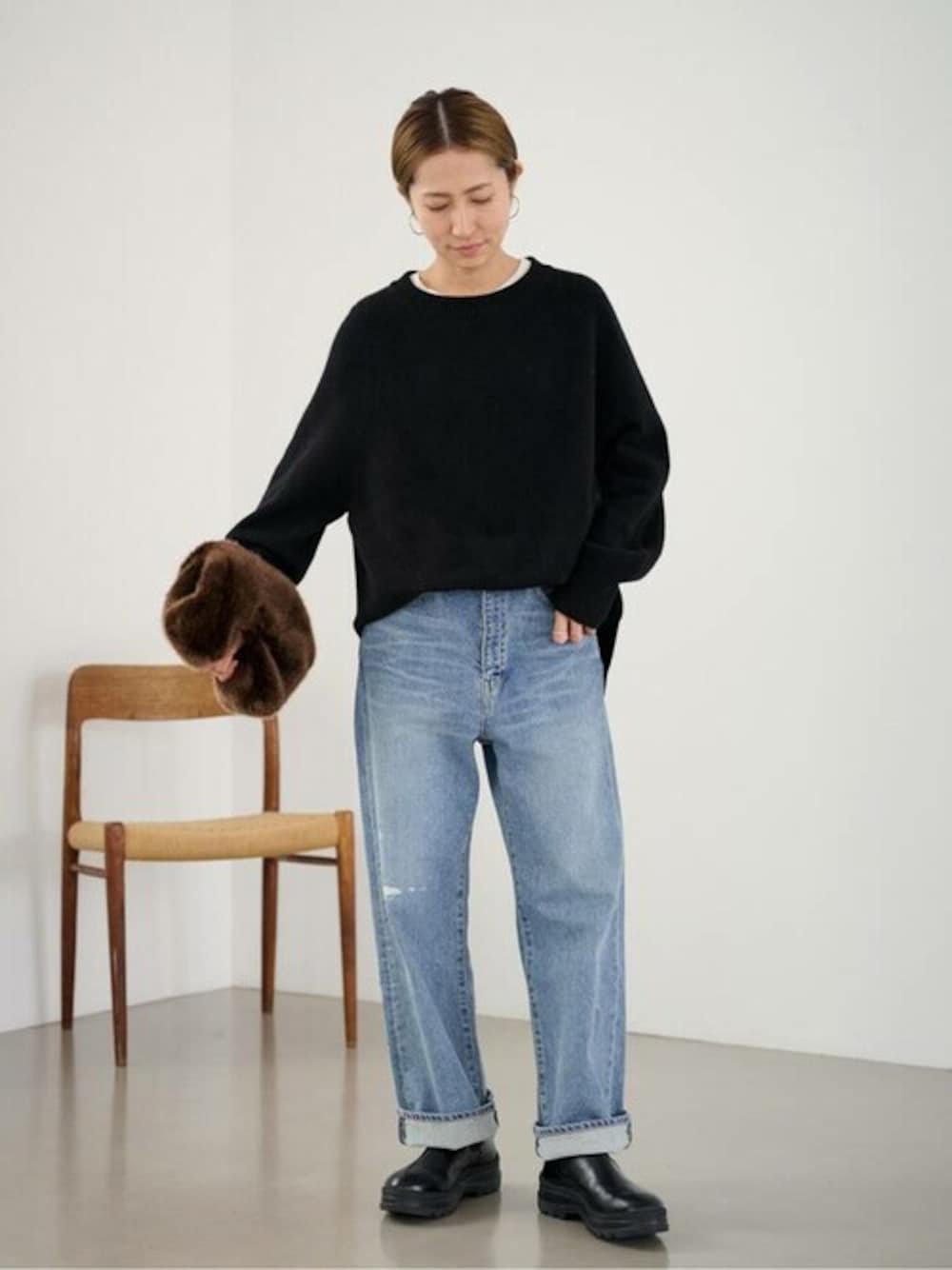≪追加≫デニムストレートパンツのコーディネートスナップ 体型:細身/普段サイズ:36 軽くて包み込んでくれるような着心地が魅力のニット。 ふっくらとした、オーストラリア産バージンエキストラスーパーファインウールを使用。 肌触りが良く、目を惹く綺麗な発色も特徴です。 襟ぐりを横にやや広く開けているので、カットソーのレイヤードスタイルもおすすめです。