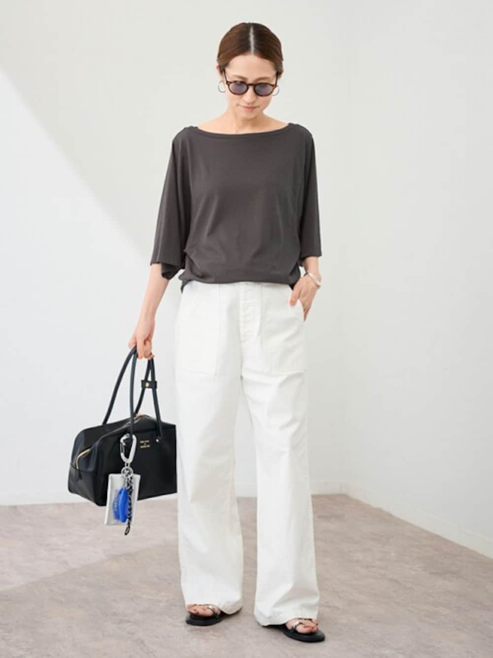 【ニュアンスTee】 さっと着るだけで抜け感のあるシルエットに仕上がるシンプルTシャツ。 ゆったりとしたドルマンスリーブのようなシルエットで、リラックスした着心地ながらもこなれた印象に。 前後2WAYで楽しめるネックラインは、その日の気分やスタイルに合わせて変化をつけられます。 ----------------------- ミリタリースラブバックサテンベイカーパンツ 品番:25030220304030 ※今後入荷予定 -----------------------