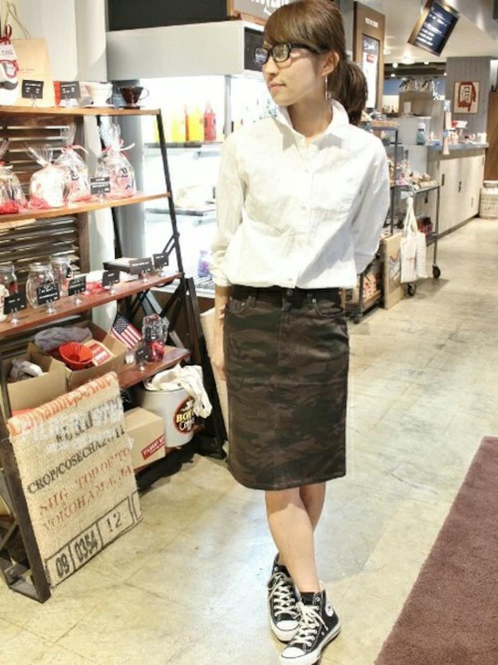 この春大人気のミリタリー柄はタイトスカートが注目です! シャツを合わせて大人っぽいカジュアルな着こなしに。 足元はもちろんスニーカーで!