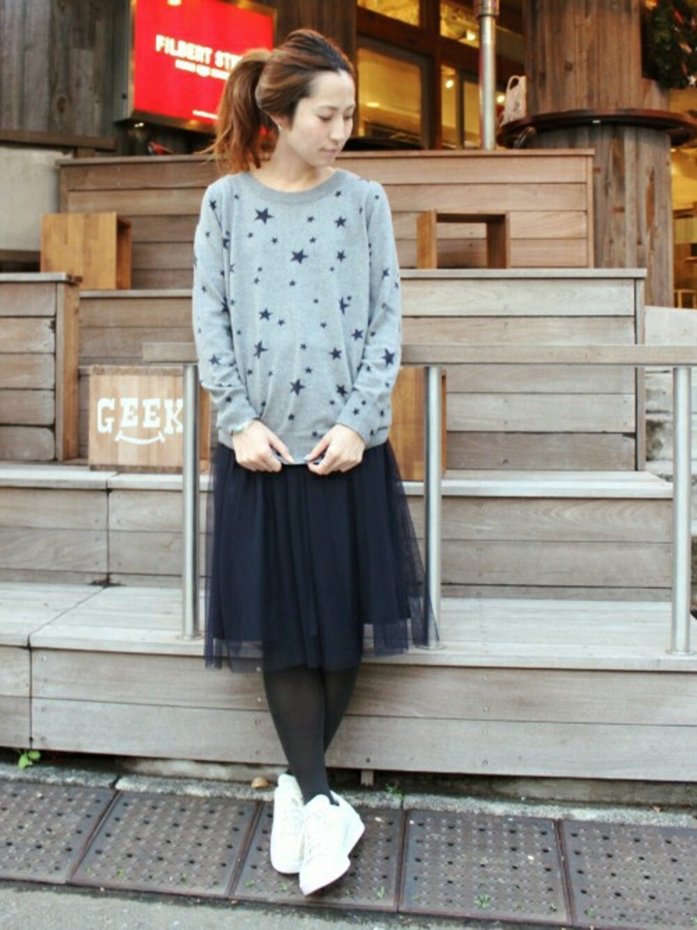 スター柄ニットとふんわりチュールのスカートのコーデは色味を統一させて合わせました♪グレー×ネイビーで大人な雰囲気に。。。