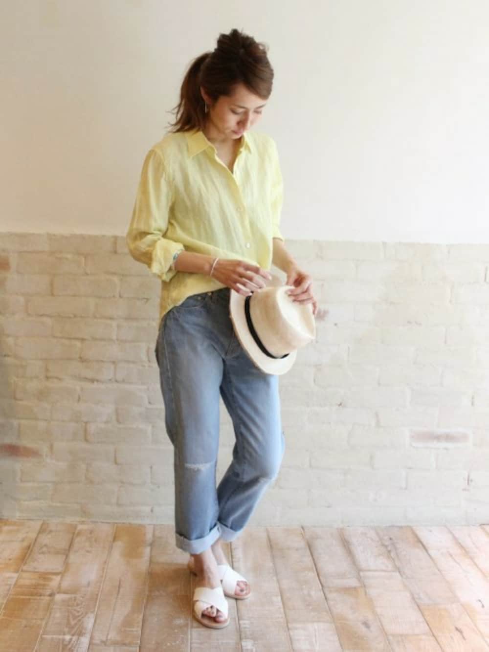 シンプルなリネンシャツは色物をチョイスするものオススメ!気分も上がるような爽やかなイエロー。定番のデニムスタイルも雰囲気アップ。