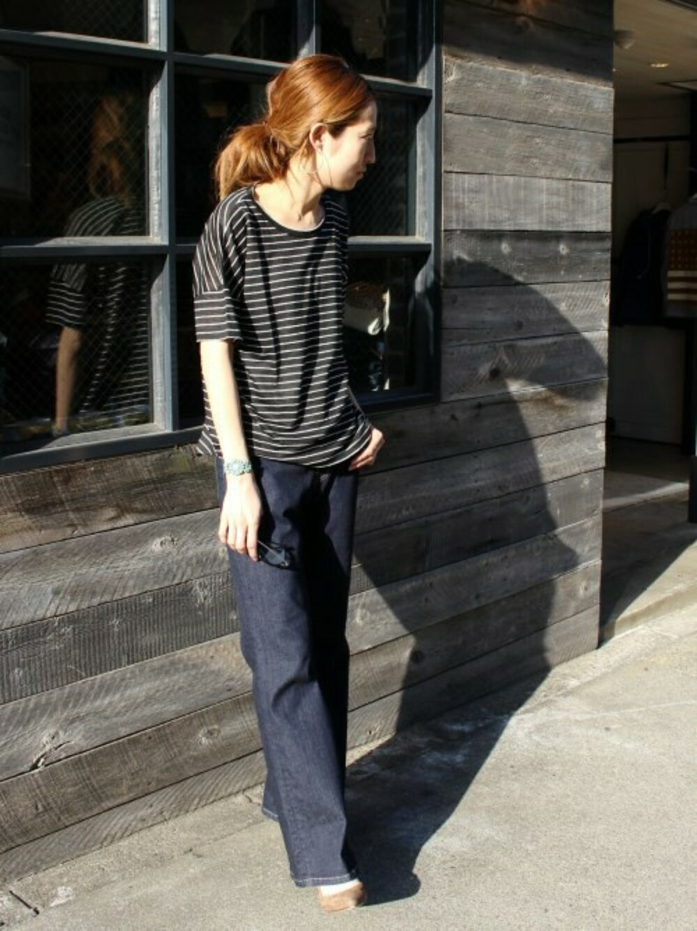 リネンのボーダートップス。肩を落としたデザインがポイント。大人っぽく、フレアデニムで。