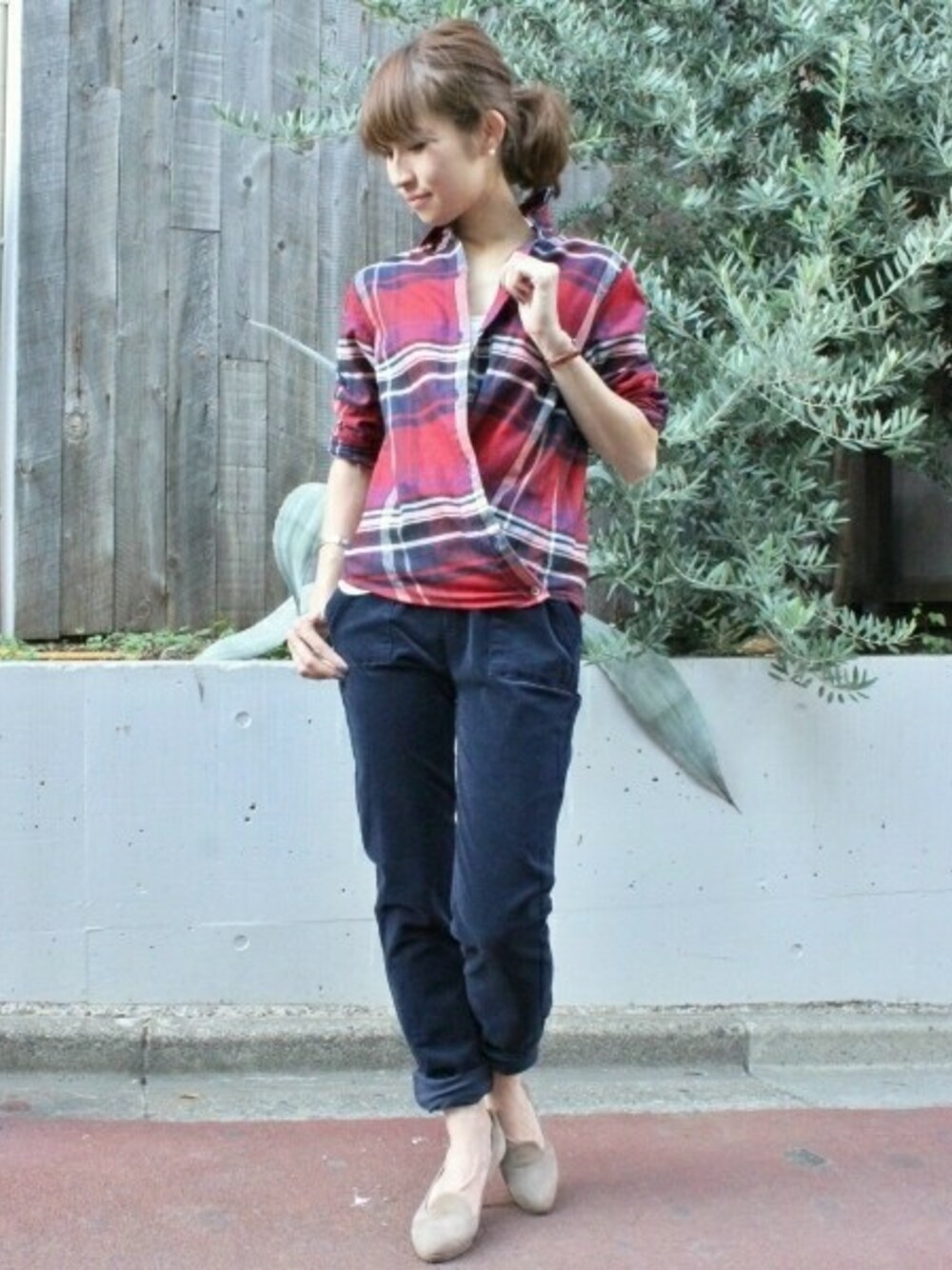 大人気のチェックシャツのシンプルコーデ。冬にはざっくりニットを羽織ってブーツインスタイルも◎