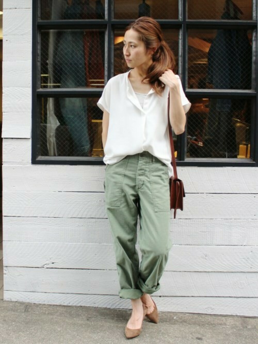 トロミのあるブラウスにカーキのベイカーパンツでカジュアルに♥︎