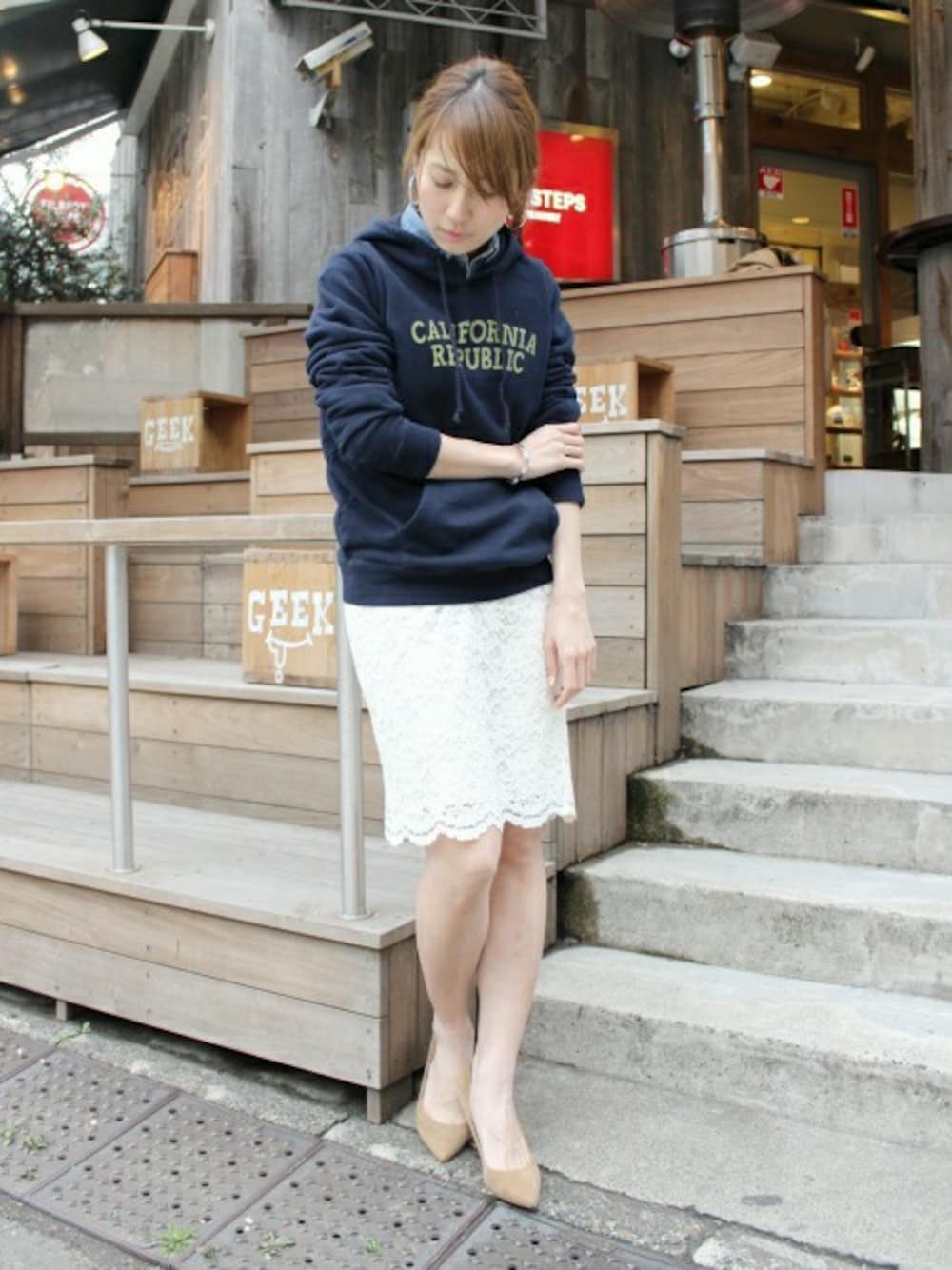 カジュアルなパーカーをレースのタイトスカート合わせて可愛らしくコーデ。ネイビー×ホワイトが春らしく明るい印象に!