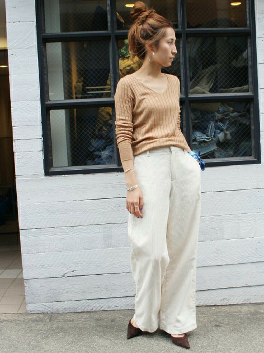 キャメルとホワイトで柔らかなカラーあわせ。スタイリングしやすいリブトップスは秋も欠かせないですね☆