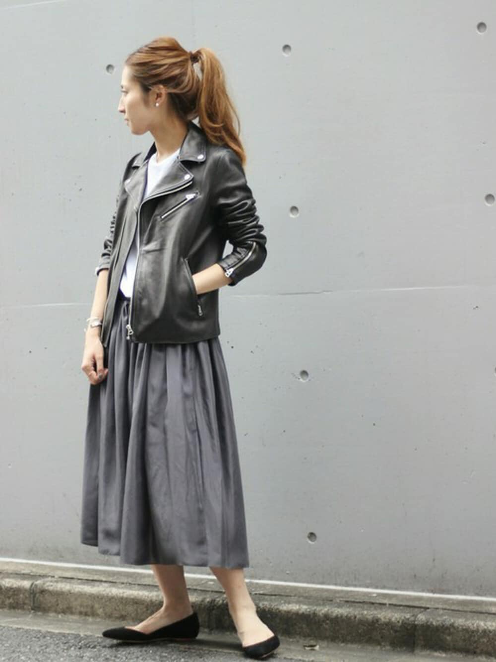 黒のライダースは定番で持っておきたいアイテム♡シルクのやわらかスカートと合わせて。