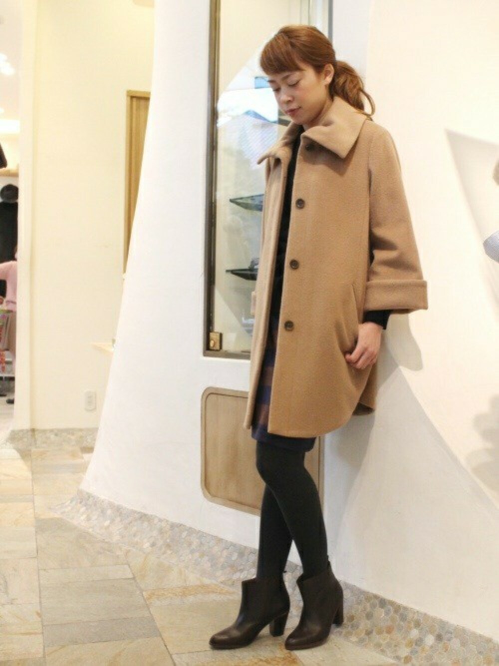 女性らしいAラインが可愛いコートは羽織るだけでコーディネートのポイントに!柔らかい素材と軽めな着心地がオススメの一枚!ショートブーツでスッキリ合わせて。